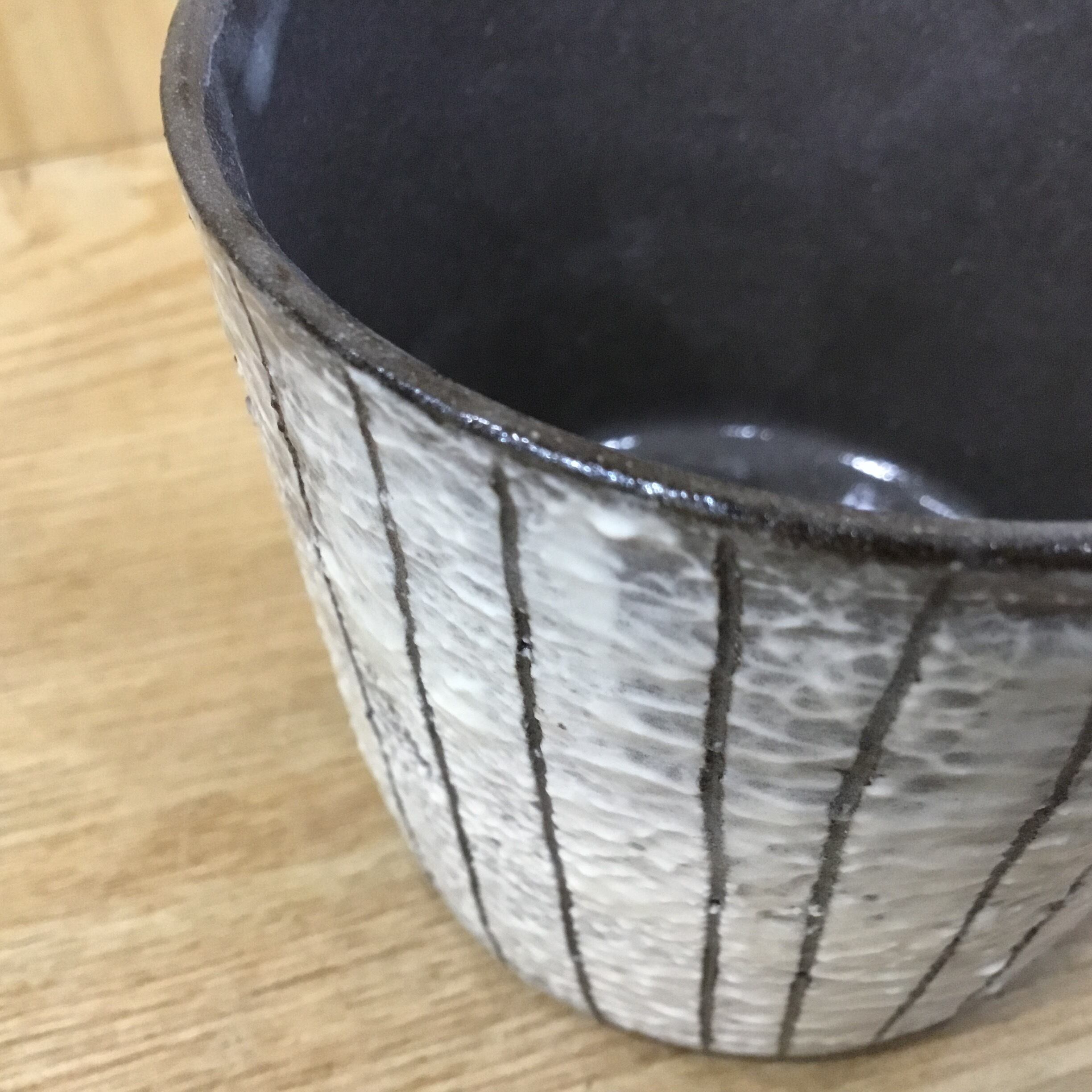 粘土は赤土を使用し、ろくろ成形の後、線文様を彫り込みます。